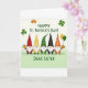 This card shows five gnome-like leprechaun pals lined up side by side, their long white beards brushing their tunics as they lean subtly toward one another like close friends. The leftmost figure wears a dotted crimson hat and outfit and lifts a golden tankard toward the group, as if inviting a shared toast 💚. On the far right, a gnome in polka-dotted orange holds a shiny gold pot while green and yellow balloons rise above it, adding a light, flirty lift to the scene ☘️. In the middle, the gnomes mix stripes and speckles in yellow, emerald green, and black, with tall cone hats that create a tidy rhythm across the row. The background fades from creamy white at the top into a pale green wash, giving the characters a soft stage without distracting from their faces and props. Near the top, “HAPPY ST. PATRICK’S DAY!” sits in green lettering, accented by a trio of clovers including a four-leaf one. Just below that, “DEAR SISTER” appears in green, centered above the figures. Golds, greens, reds, and oranges repeat across hats, clothes, and treasures, with the balloons floating upward from the pot against the light green gradient.