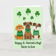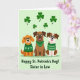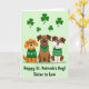 This greeting card shows three dressed-up dogs standing close together on a deep green ground, sharing the kind of easy closeness that feels like family on St. Patrick’s Day 💚. Behind them, a pale green background keeps the scene light while five shamrocks drift around like little lucky accents ☘️. On the left, a russet dog wears a rich green sweater with small shamrock patterns and round glasses, leaning slightly toward the others as if listening in. In the middle, a sturdy brown dog sports a patterned green bandana, with its tongue peeking out in a friendly, teasing grin. On the right, a piebald dog in a horizontally striped green sweater and black-framed glasses looks outward, but its body angle stays turned toward the group like it doesn’t want to miss the moment. Along the bottom, bold friendly lettering reads “Happy St. Patrick’s Day!” with “Sister in Law” placed beside it in matching dark text. The greens range from soft mint in the sky to deeper emerald at the base, with warm browns in the fur balancing the palette. Five shamrocks float across the pale green backdrop above the trio.