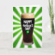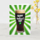 This card features a classic tapered pint glass filled with deep, dark stout, topped with a thick cap of tan foam that looks soft enough to leave a “foam mustache.” Across the front of the glass, white text reads “HAPPY ST. PATRICK’S DAY!” and it sits proudly in the center where your eye lands first. Just beneath the wording, a bright green shamrock adds a little wink of Irish charm ☘️. Behind the glass, emerald green and white rays burst outward in a radial pattern, like a spotlight that makes the drink feel like the star of the party. The rich brown-black beer against the creamy foam suggests a cozy toast shared across the table, the kind where friends lean in close and laugh over the first sip 💚. The high-contrast background keeps the scene lively while the centered glass gives it a steady, inviting focus. The foam’s rounded edge and the crisp rays around it create a sharp, graphic look with green and white stripes radiating to the edges.