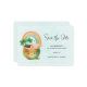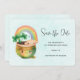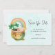 Save the date card with an adorable illustration featuring a smiling green and gold pot with a cute rainbow,