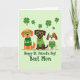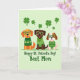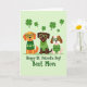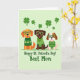 This card shows three friendly dogs lined up on a thin ground line against a light green background, looking like they’ve dressed up together for St. Patrick’s Day 💚. One dog has golden fur, one is deep chocolate brown, and the third is white with warm brown patches, and their close spacing and side-by-side poses suggest an easy, affectionate bond. Above their heads, several four-leaf clovers float across the top half of the design, adding a festive touch ☘️. Each pup wears green glasses, and the matching color makes them feel like a little group photo where everyone agreed on a theme. Their sweaters are different—one has a cable-knit look with three shamrocks on the chest, another wears a green V-neck, and the third has a green-and-white striped pullover. Along the bottom, the message “Happy St. Patrick’s Day! Best Mom” sits in green lettering, centered near the base so it reads right under their paws. The outlines are crisp and the colors are soft and even, with the clovers scattered overhead and the trio of dogs anchored neatly below.