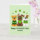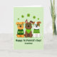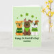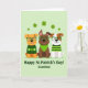 On the front of the card three upright, human-like dogs sit close together against a soft lime-green background sprinkled with darker green four-leaf clovers ☘️. The left dog is golden-orange and wears a deep green sweater with three lighter shamrocks across the chest, leaning slightly toward the others as if posing with close friends. In the middle, a brown dog wears a green bandana with small stitched details, its gentle sideways glance adding a cozy, togetherness feel. On the right, a white dog with brown patches wears a green-and-white striped sweater, tucked in close so their shoulders nearly touch 💚. All three have matching green-rimmed glasses, giving them a smart, friendly look that feels like an inside joke shared between them. Centered beneath the trio, dark green lettering reads “Happy St. Patrick’s Day!” on one line, with “Grandson,” placed just below in the same dark green. The clovers are scattered across the background at varying angles, framing the dogs and leaving open space around the text.