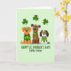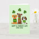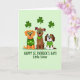 This card shows three cartoon dogs lined up across the center on a light mint-green background, leaning close like close friends posing for a photo 💚. The golden dog on the left wears a green sweater dotted with shamrocks and oversized green glasses, smiling wide as if sharing an inside joke. In the middle, a brown dog sports a green bandana with matching round glasses, giving the others a fond, attentive look. On the right, a smaller white-and-brown patched pup wears a green-and-white striped sweater and green specs, tilting in toward the group with a sweet, eager expression ☘️. Near the top, four emerald shamrocks float above their heads, spaced like little accents across the upper area. Beneath the dogs, the message “HAPPY ST. PATRICK’S DAY! Little Sister,” appears centered in green lettering, with “Little Sister” following after the main line. The greens in the outfits and shamrocks stand out against the pale background while the dogs’ fur tones add warm contrast.