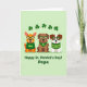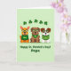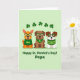 Designed with a soft pastel green background, this St. Patrick’s Day card centers on three upright, human-like dogs sitting close together with tongues out and bright, friendly eyes that make them look like a tight little crew. Above their heads, five green shamrocks float in a loose scatter, adding a festive touch ☘️. On the left is an orange pup with big ears wearing a dark green sweater with two shamrocks and green-rimmed glasses, angled toward the others as if leaning into the moment. In the middle, a warm brown dog wears a green bandana marked with one shamrock and matching green glasses, sitting calmly beside its pals like the steady friend in the group 💚. On the right, a brown-and-white dog wears a striped green sweater that hints at classic Irish knit patterns, its grin turned toward the center as though sharing a private joke. Beneath the trio, the message “Happy St. Patrick’s Day! Papa” appears centered near the bottom in green lettering. The three dogs’ green accessories—glasses, sweaters, and bandana—stand out crisply against the pale green field, with the shamrocks hovering above them.