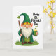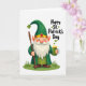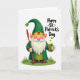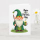 Designed with a gnome-like figure centered on a white background, this St. Patrick’s Day scene feels friendly and a little romantic, like he’s raising a toast to someone just off to the side 💚. He wears an emerald outfit and a tall pointed green hat topped with a four-leaf clover ☘️. A gold circlet set with ruby-red gems sits above his big white beard, and his rosy cheeks and red nose give him an easy, welcoming look. A short arc of green grass curves beneath his feet to anchor the character in the open space. In his left hand he holds a knotted wooden staff, while his right hand lifts a mug filled with frothy green beer as if inviting a shared laugh. The phrase “Happy St. Patrick’s Day” sits in the upper right in green lettering, with small shamrocks scattered around it like confetti. Bright, even lighting adds soft shadows along the beard, hat brim, and mug, while the shamrocks hover near the text against the white backdrop.
