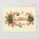 Vintage holiday postcard of man and woman shaking hands. Decorated with green shamrocks and pink flowers for Saint Patrick's Day.