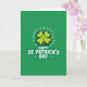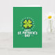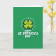 This card features a lime-green three-leaf clover character centered on a deep emerald background, smiling with small dot eyes and a gentle, friendly expression 💚. Subtle shading along the clover’s rounded edges gives it a soft, slightly dimensional look, like it’s leaning in close for a warm hello. Around it, short white dash marks form a loose halo, adding a sparkly, celebratory burst without crowding the scene ☘️. The setting stays simple and focused, with the rich green field acting like a cozy backdrop that keeps your attention on the character. Beneath the clover, the text “HAPPY ST. PATRICK’S DAY” sits centered in bright white, using a neat sans-serif style that reads easily at a glance. The letters have a faint raised effect, making the message stand out against the darker green while still feeling smooth and modern. The contrast between the white accents and the layered greens keeps everything crisp and easy to see, with the radiating dashes forming an even ring around the smiling shamrock.