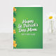 Designed with a rich green background that shifts gently from darker to lighter tones, this St. Patrick’s Day card sets a cozy, affectionate scene 💚. Centered across the middle, the main line reads “Happy St. Patrick’s Day Mom” in white lettering with a soft shadow that makes it stand out from the green. Just below, “BEST MOM EVER” appears in white, all caps, and slightly smaller, keeping the focus on the message while adding a proud, loving emphasis. Along the left edge, a vertical border of three-leaf clovers brings in a lucky touch, mixing emerald green with warm golden yellow ☘️. Tucked between the clovers are tiny star shapes and little leaf pieces in matching green and yellow, like confetti sprinkled down the side. The bright border and the layered text create the feel of a close hug and a fond smile shared between family or friends. The left-side clover ribbon runs from top to bottom, with scattered mini stars and leaf shapes floating beside it against the green field.