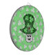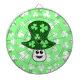 A cartoon mushroom with shamrock spots on a green cap. The background is light green with a white shamrock pattern.