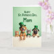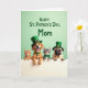 This card shows four pets peeking up from behind a bright white ledge, set against a pale green background that feels calm and festive 💚. A golden retriever in the middle wears a green top hat with a gold buckle and smiles with its mouth open, as if leaning in for attention like a close friend. To one side, a pug in a matching hat looks up with a quieter, steady gaze that reads like loyal affection. An orange tabby kitten and a grey tabby kitten press their paws to the ledge, their wide eyes and soft fur giving the scene a gentle, cozy closeness. The grey tabby adds a green bow tie, and the retriever’s green collar holds a small shamrock charm ☘️. Across the top, dark green uppercase text reads “HAPPY ST. PATRICK’S DAY, Mom,” centered above the animals and standing out clearly against the light background. The green hats and accents echo the backdrop while the white ledge creates a crisp horizontal line beneath their faces. Soft lighting highlights the pets’ eyes, the gold buckles on the hats, and the little shamrock charm near the center.