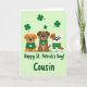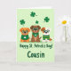 This card features three cartoon puppies lined up on a pale green background, leaning slightly toward one another like close friends posing for a photo 💚. On the left, a ginger pup wears a solid green sweater with a white shamrock on its chest, smiling toward the others with an easy, affectionate look. In the middle, a brown pup has a green bandana marked with a small clover, and its grin feels shared, as if it’s in on the same sweet joke. On the right, a white-and-brown patched pup wears a striped green jumper, angled in close to complete the tight little trio. Each puppy has matching green-rimmed glasses that tie them together and add a cozy, bookish charm. Small shamrocks float above their heads, scattered lightly across the top like confetti ☘️. Along the bottom, “Happy St. Patrick’s Day!” appears in dark green lettering with “Cousin” placed just beneath it in a smaller matching green line.