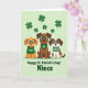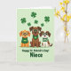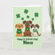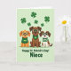 This card shows three front-facing puppies lined up against a soft green background sprinkled with small shamrocks ☘️. The left puppy is golden and wears an emerald sweater with a shamrock on the chest, plus black glasses that make it look endearingly attentive to its pals. In the middle, a rich brown pup sports a green bandana with a shamrock and green-rimmed glasses, smiling as if it’s sharing a private joke with the others 💚. On the right, a white-and-brown puppy wears a green-and-white striped jumper and matching green glasses, leaning into the group with an easy, friendly closeness. Near the bottom, the greeting “Happy St. Patrick’s Day!” appears in green lettering, with “Niece” placed nearby as a smaller add-on. Gentle shading and soft shadows under their paws give the trio a grounded look while keeping the scene light and simple. The shamrocks vary in size across the background, and the pups’ green accessories repeat the holiday color throughout the design.
