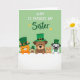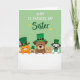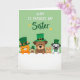 This card shows a light green springlike background where a friendly group of cartoon-style cats and dogs lean close together, their wide eyes and gentle smiles suggesting a sisterly bond 💚. Along the bottom, they peek over a wide white band, as if gathering for a group photo and nudging shoulders in quiet affection. Each animal wears a green top hat with a small golden buckle, and one grey-and-white dog adds a green bow tie for extra charm ☘️. Near the top, large white text reads “HAPPY ST. PATRICK’S DAY,” standing out clearly against the green. Just below that, the word “Sister” appears in deep green lettering, centered and slightly more flowing than the line above. Small gold four-petal flower shapes sit to either side of the main greeting, adding a soft decorative touch. The characters include an orange cat, a larger brown dog, a smaller tan pup, a tiny ginger kitten, and the grey-and-white dog, all lined up behind the white strip with their hats tilted at slightly different angles.