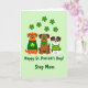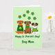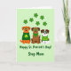 This card shows three cartoon dogs lined up across the lower middle, leaning close as if they’re best friends posing for a photo on St. Patrick’s Day 💚. The left dog is sunny orange, wearing green glasses and a green sweater with a four-leaf clover centered on its chest. Next to it, a warm brown dog smiles with green glasses and a green bandana, angled toward the others like it’s sharing the moment. The third dog is white with brown spots, dressed in a green-and-white striped sweater and matching green glasses, completing the coordinated look ☘️. Behind them is a pale green background with seven darker green shamrocks scattered above their heads like confetti. Each dog has a tiny pink tongue peeking out, adding a sweet, friendly touch as they look outward together. Along the bottom, “Happy St. Patrick’s Day!” appears in green lettering, with “Step Mom.” placed just below it in the same green.