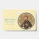 St. Peter Claver (1580-1654) was a Spanish Jesuit priest and missionary. In 1610, St. Peter volunteered to serve in the New Kingdom of Granada in the Americas, which encompassed present-day Panama, Colombia, and Venezuela. There he worked for forty years ministering to slaves upon their arrival at Cartagena, a major hub in the Transatlantic slave trade, and on the plantations in the neighboring countryside. His tireless efforts not only to convert the slaves to Catholicism by preaching Christ crucified but to ameliorate their sufferings earned him the epithet “Slave of the Africans”. + Here St. Peter is shown clad in Jesuit garb—a black cassock and collared cape. He holds a simple brown wooden cross and a crown of thorns, symbols of Jesus as “a man of sorrows and acquainted with grief” (Isaiah 53:3). The image is enclosed in an inner frame reminiscent of a Gothic eight-petalled rose (or wheel) window; the corners of the simple, square outer frame are filled with heraldic thistles. + St. Peter Claver died on 8 September 1654 of natural causes after a long illness. He is patron saint of Inter-racial justice, African Americans, African missions, slaves, and the Republic of Colombia. + Feast: September 9 + Image Credit (BK 058): Antique image of S[aint] Petrus [Peter] Claver, S.J., originally published in chromolithography by B. Kühlen, Mönchengladbach, Germany, unnumbered Jesuit Series, late 19th century, from the designer’s private collection of religious ephemera. + Feel free to change texts, fonts, and colors!