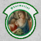 Image Credit (M 012): Antique vignette of St. Raphael the Archangel and Tobias, 19th-century hand-colored engraving, original publisher unknown, from the designer’s private collection of religious ephemera. Tobias holds a large fish that he caught in the Tigris River at the archangel’s direction. Its various body parts were used to exorcise a demon and to cure Tobias’s father of blindness. + St. Raphael the Archangel is patron of pharmacists as well as physicians, nurses, and travelers among others. + Feast: September 29 + Green and white are the colors traditionally associated with pharmacy.