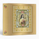 Featuring a beautiful traditional Catholic image of St. Therese the Little Flower with pink roses on the front and the quote "It is love alone that counts." on the back. A gold sheen background is behind these images.