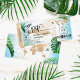 US Virgin Islands, St Thomas, Destination Beach Wedding Boarding Pass Ticket Gold Plane Save the Date with heart and plane icon with tropical leaves
