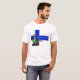 This was one of my first St. Urho designs which I've cleaned up a bit and redone this t-shirt for. The background is the Finnish flag, which is white with a blue cross. On this t-shirt the white against white isn't distinctive. But, if you buy this on another color, the white flag outline will pop out. You can buy t his on any of the clothing items offered for men, women and kids. The text can be changed or removed. Designed by Sheila Cicchi, Brownielocks.com. All Rights Reserved.