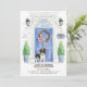 Announce your new address with our stylish announcement featuring a Stabyhoun, blue front door, welcome mat, slate sign, topiaries and a floral wreath set on a gray brick background.