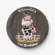 Adorable Farm Animals Birthday Party paper plates. Features a stack of cute farm animals: pig, cow, sheep, rooster, goat and baby chick on a dark barn wood background. Great for a 2nd birthday, but any age will work.
