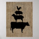 Great rustic design features stacked farm animal silhouettes (rooster, pig, sheep, cow) on burlap texture background
