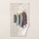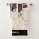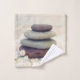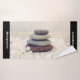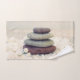 Towel set with a photograph featuring rocks stacks on top of each other. Surrounded by loose white rocks and little white flowers.