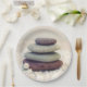 Paper plates with a photograph featuring rocks stacks on top of each other. Surrounded by loose white rocks and little white flowers.