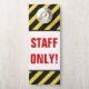 This design features the message "STAFF ONLY!" in bold red text, along with black and yellow caution stripes.