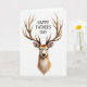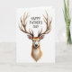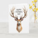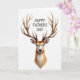 This design shows a tall stag centered on a wide white background, painted in soft washes that resemble watercolor. Its head and neck face forward, with a gentle, steady gaze that feels like a quiet bond between parent and child 👨. Above the antlers, the words “HAPPY FATHER’S DAY” sit near the top in dark lettering, evenly spaced and easy to read. The fur is shaded in warm browns and creamy highlights, blended to suggest a soft, textured coat. Light pink tones warm the inner ears, and tiny bright specks in the eyes add a tender, attentive look. The antlers rise in branching curves, creating a natural arch that frames the message like protective arms. Subtle gray-brown shading along the neck and antler edges gives the figure depth against the plain backdrop 🛠️. The branching antlers stretch upward in textured lines, with the text nestled neatly in the open space between their curves.