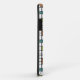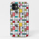 This phone case has a mid-century modern design of a grid of black lines with squares and rectangles in retro colors on a field of white.