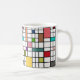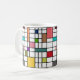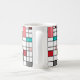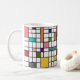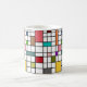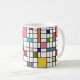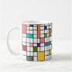 This mug has a mid-century modern design of a grid of black lines with squares and rectangles in retro colors on a field of white.