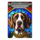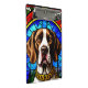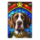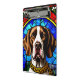 Vibrant stained glass artwork featuring a dog's portrait surrounded by colorful paw designs, symbolizing joy and loyalty.