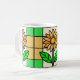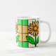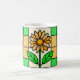 a stained glass window illustration of a yellow and white daisy with green leaves.