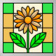 a stained glass window illustration of a yellow and white daisy with green leaves.