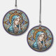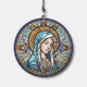 Beautiful wind chime features an AI generated round portrait of the Madonna in stained glass.