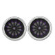 A lovely stained glass pattern adorns these cufflinks in dominant colors of purple, blue, yellow and black. Twelve abstract feathers circle a central mask to form a spiritual mandala design with a Native American sensibility.