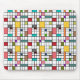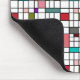 This mouse pad has a mid-century modern design of a grid of black lines with squares and rectangles in retro colors on a field of white.