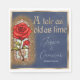 The background is an antique looking blue parchment paper design, bordered with a gold frame. An image of a stained glass red rose is placed on the left, accented with a gold glitter pattern. A tale as old as time is printed at the top in a medieval style font.