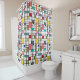 This shower curtain has a mid-century modern design of a grid of black lines with squares and rectangles in retro colors on a field of white.