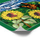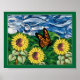 Stained glass rendition of a sunflower field visited by a monarch butterfly.