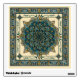A stained glass pattern mandala in teal green, varying blue and turquoise shades, and gold accents on a peachy ecru beige.