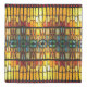 Vibrant stained glass design features an array of colors, arranged in symmetrical patterns.