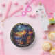 This stained glass inspired design depicts a witch's cauldron and jack-o-lanterns against a backdrop of a castle under the Samhain full moon.