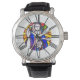 Bright and Colourful Stained Glass Design with Religious Figure. The watch face has Roman numerals. Gift for a church goer.