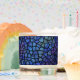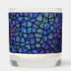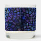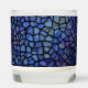 This scented jar candle features a textured surface composed of numerous irregular pieces, arranged in a non-uniform pattern across the entire frame. The dominant color scheme consists of various shades of blue ranging from deep plums to light sky blues, creating an effect reminiscent of a stained glass window or a mosaic. Each piece seems to have a different shape and size, some resembling shards or fragments of glass. They are outlined by a thin, dark line that accentuates their edges against the lighter background. There is a gradient of colors within the blue hues; for example, some areas display a mix of purples and blues, while others present a more uniform color with slight variations in saturation. The texture of the surface is complex, with variations in the granularity and roughness of the individual pieces. Some sections have a smoother finish, while others appear speckled or grainy, adding depth to the overall appearance. The light reflects off these surfaces differently, giving the piece a three-dimensional quality.