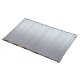 A riveted 3d brushed metal plate on a construction hazard stripes background.