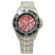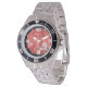 Has heft and feel of expensive stainless steel quartz watches. Good band with safety catch. I removed links, which is easy because engraved arrows show direction to push the linking pins. As always by this seller, the image (a railroad logo) is a perfect reproduction of my emailed image, and is precisely spaced and aligned.