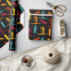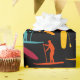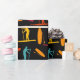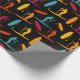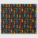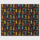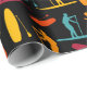 Wrap up gifts for your favorite paddle boarder in style with this fun wrapping paper. It features illustrations of paddle boarders and paddle boards in rust red, orange, yellow and teal blue set against a black background.