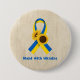 Show your support with this special button featuring ribbon in the blue and yellow colors of Ukraine's flag with sunflowers, the national flower of Ukraine on wood texture background